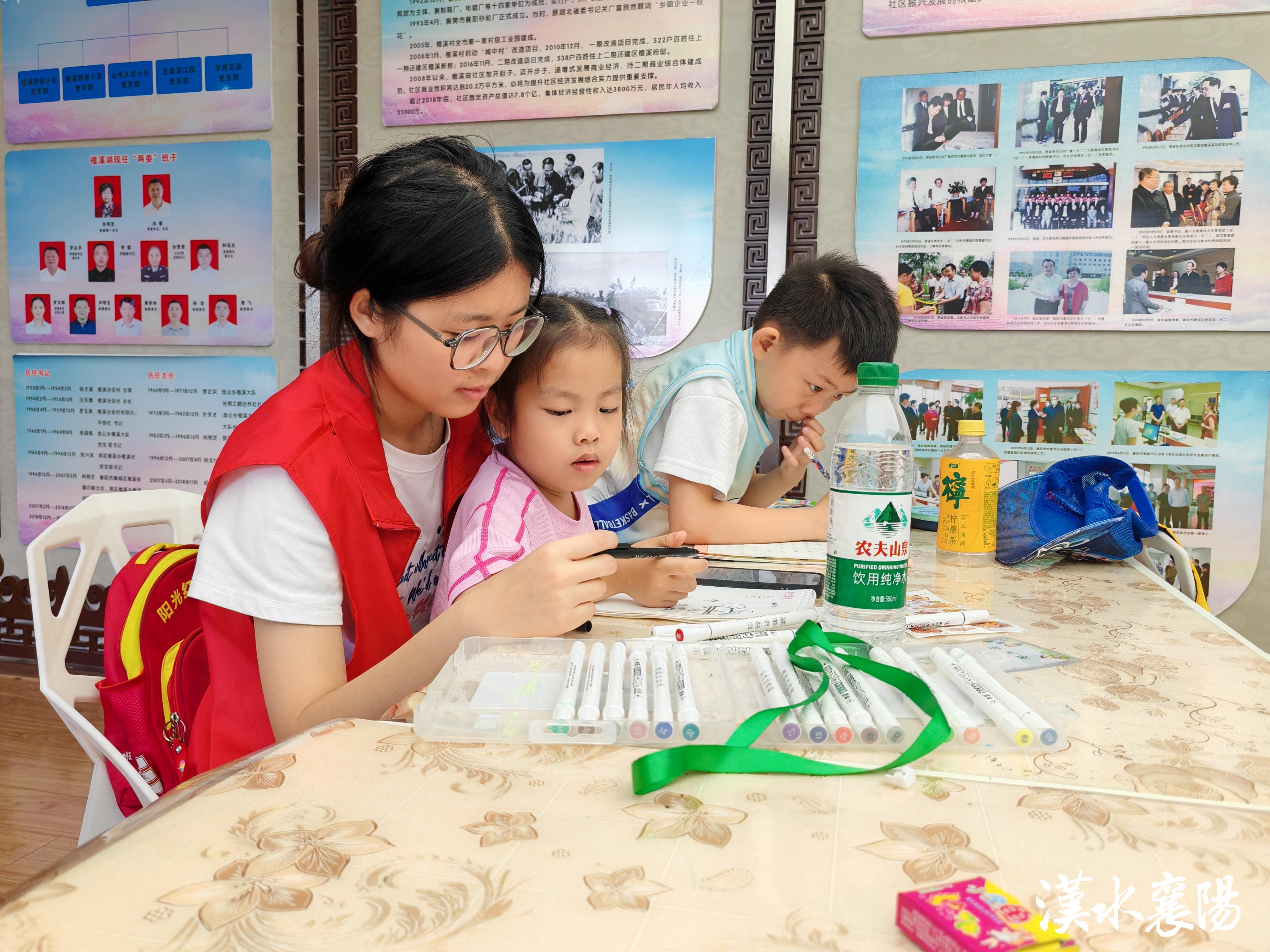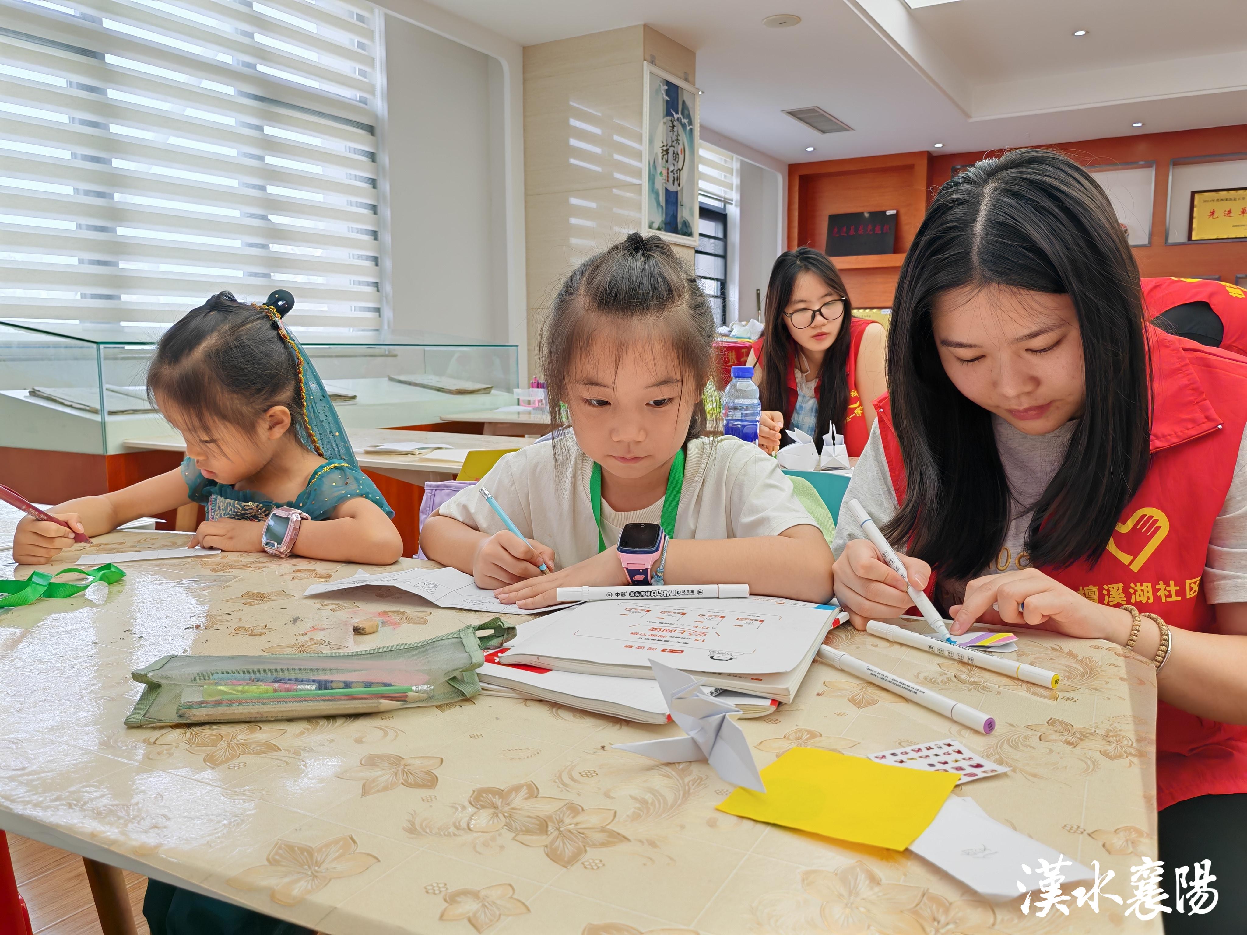 襄城区檀溪湖社区活动室内,志愿者正在辅导孩子绘画